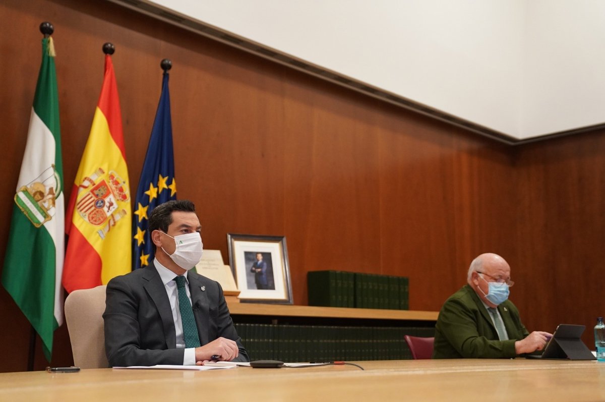 Juanma Moreno (i.) y el consejero de Salud, Jesús Aguirre (d.), este miércoles, durante la Conferencia de Presidentes celebrada de manera telemática - JUNTA DE ANDALUCÍA