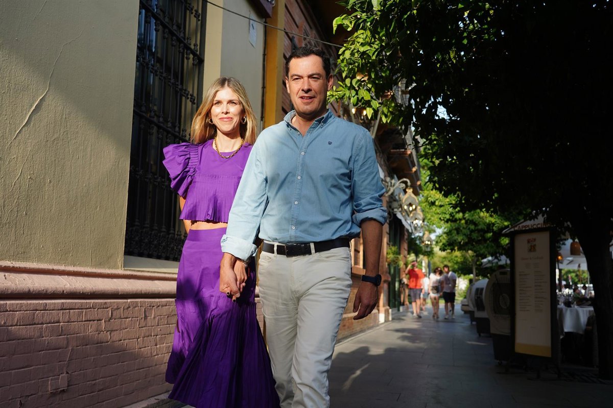 El presidente del PP andaluz y de la Junta, Juanma Moreno, junto a su mujer, Manuela Villena, llegando a la sede del PP-A, este domingo - EDUARDO BRIONES-EUROPA PRESS