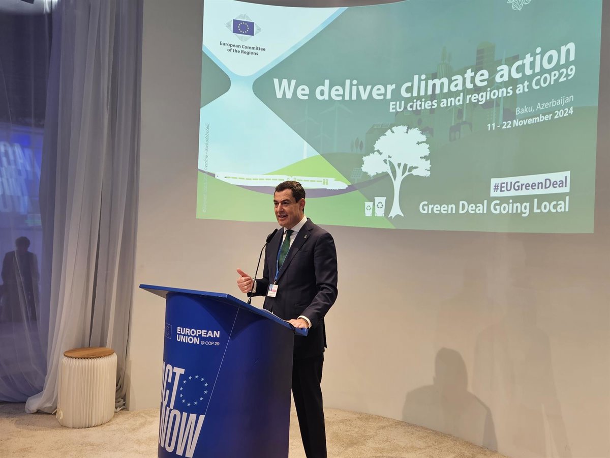 El presidente de la Junta de Andalucía, Juanma Moreno, en rueda de prensa en Bakú durante su participación en la Conferencia de las Naciones Unidas sobre el Cambio Climático (COP29). - EUROPA PRESS
