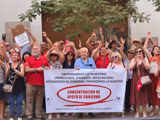 Entre los simpatizantes de Sánchez hay personas que portan banderas del PSOE, banderas LGTBI y alguna bandera de España. Muchos de ellos son pensionistas y, de hecho, portan un cartel en el que piden defender las pensiones, la educación y la sanidad.