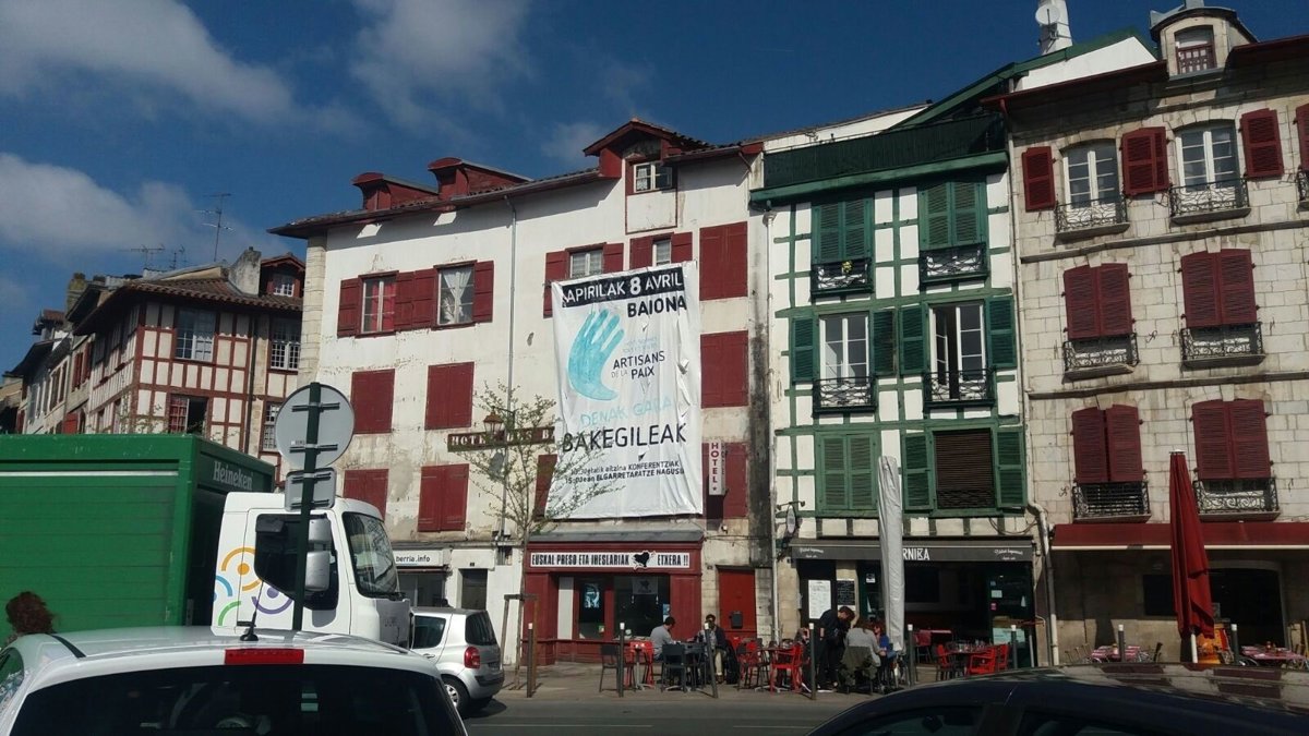 En la propia cartelería del acto propagandístico celebrado este sábado en el Ayuntamiento de Bayona se alude a lemas sobre los presos. En la fachada del edificio donde se han reunido Ram Manikkalingam y otros 'verificadores' lucía, de hecho, el clásico lema 'Euskal preso eta iheslariak etxera' (Presos y refugiados vascos a casa).