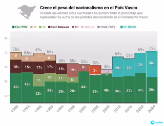 Es en este contexto en el que el PNV y EH Bildu (pese a la bajada de los jeltzales) reunirán más parlamentarios que nunca en la Cámara, cuando además solo existen dos partidos nacionalistas en el Parlamento, después de que históricamente haya existido más siglas nacionalistas, como EA, Aralar o Euskadiko Ezkerra, en los primeros comicios.