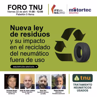 La 16 edición de Motortec Madrid, la mayor feria de la posventa de automoción del sur de Europa, acogerá el próximo 22 de abril el Foro 'La nueva ley de residuos y su impacto en el reciclado del neumático fuera de uso', organizado por TNU Tratamiento de Neumáticos Usados.