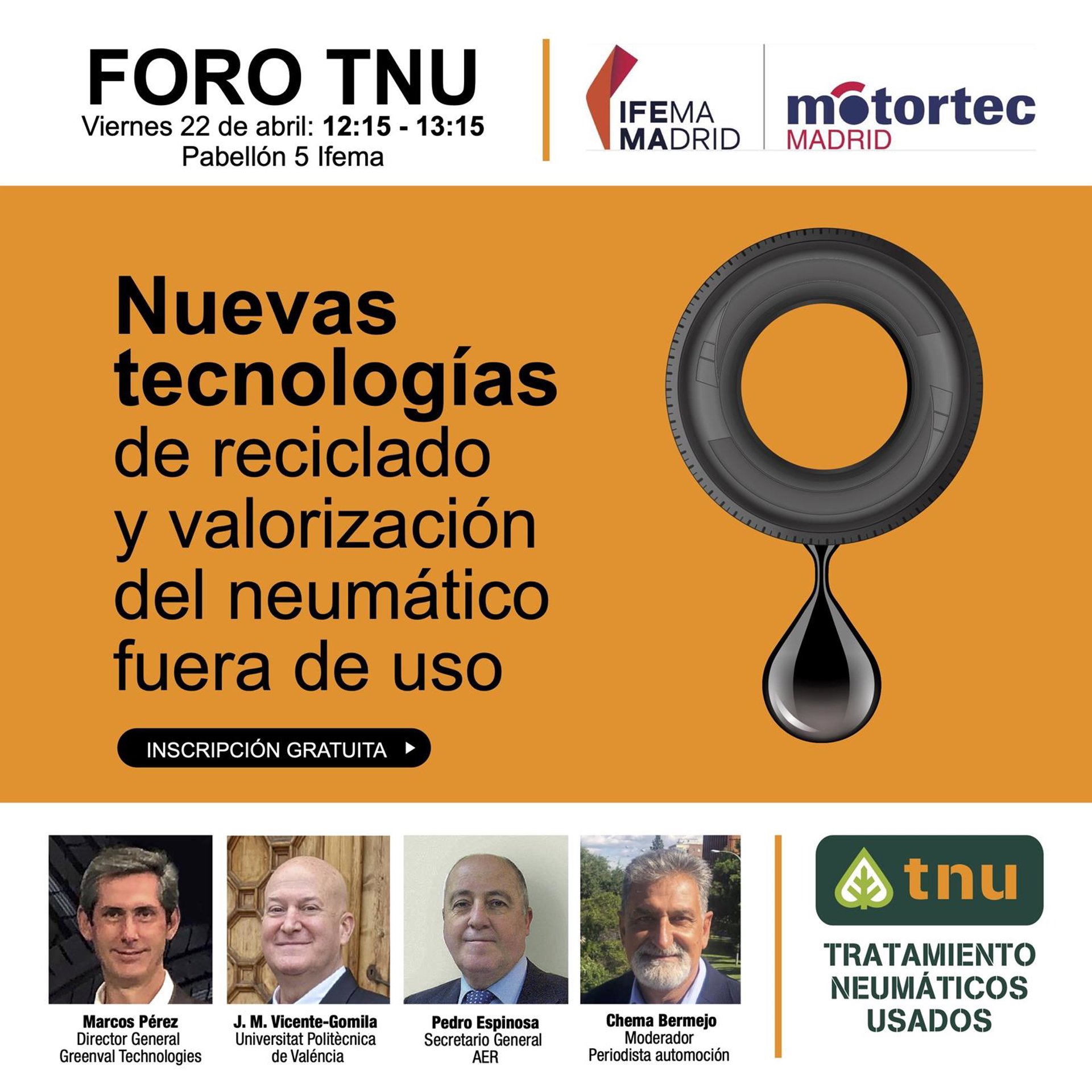 La 16 edición de Motortec Madrid, la feria de la posventa de automoción del sur de Europa, acogerá el próximo día 22 de abril el foro 'Las nuevas tecnologías de reciclado y valorización del neumático fuera de uso', organizado por Tratamiento de Neumáticos Usados (TNU).