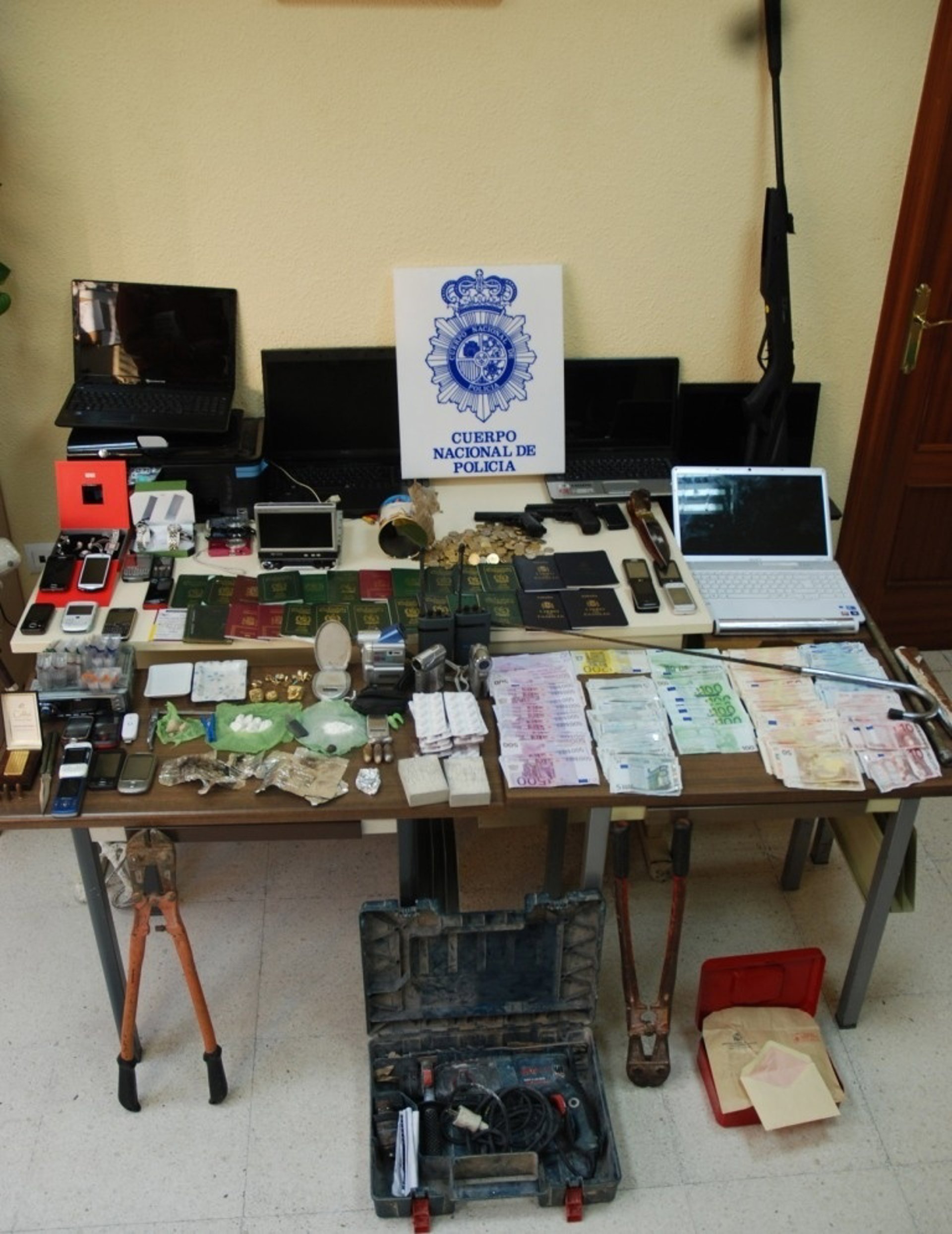La Policía ha explicado que en los cuatro registros practicados, fueron localizadas numerosas personas adictas a sustancias estupefacientes y se intervinieron más de 28.000 euros en metálico, casi cien gramos de cocaína, cinco bellotas de hachís, tres armas de fuego, un bastón estoque, puñales, básculas de precisión y útiles de elaboración y corte de droga así como diferentes sustancias para tal fin. Igualmente, se incautaron de teléfonos móviles, ordenadores, videocámaras, equipos de transmisión, vehículos a motor, abundantes joyas y pasaportes.
