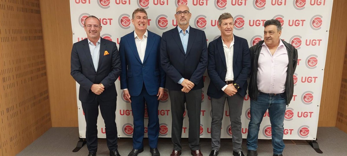 (I-D)El consejero delegado de Orange España, Jean-Franois Fallacher, su homólogo en Vodafone España, Colman Deegan, el presidente de Telefónica España, Emilio Gayo, el secretario general(SG) de UGT Comunicaciones, Alfredo Mesa, y el SG de FeSMC-UGT - UGT