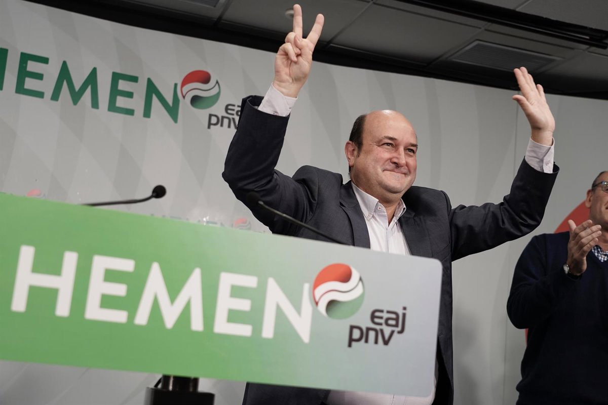 El presidente del EBB del PNV, Andoni Ortuzar durante su intervención en la sede del PNV en Bilbao(Vizcaya, País Vasco, España), donde el partido sigue los resultados del escrutinio, a 10 de noviembre de 2019. - H.Bilbao - Europa Press