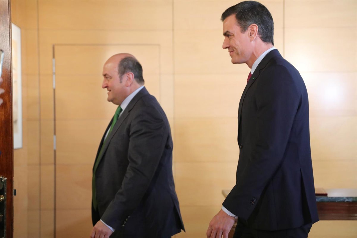 Archivo - El presidente del Gobierno en funciones, Pedro Sánchez (dech) y el presidente del EBB del PNV, Andoni Ortuzar (izq), a su llegada al por la firma del acuerdo entre el PSOE y el PNV para la investidura de Pedro Sánchez, en el Congreso de los Dip - Jesús Hellín - Europa Press - Archivo