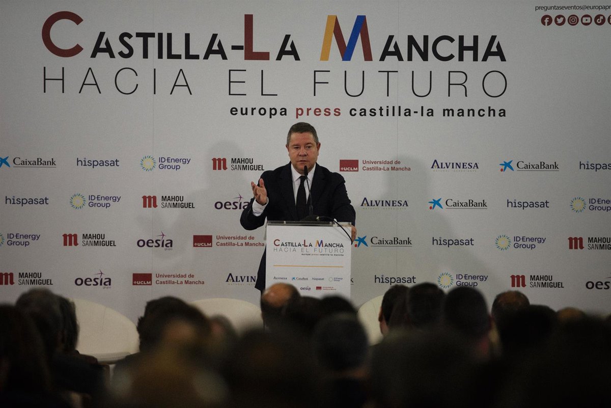 El presidente de C-LM, Emiliano García-Page, durante su conferencia inaugural en las jornadas 'Castilla-La Mancha hacia el futuro' organizadas por Europa Press. - MATEO LANZUELA/EUROPA PRESS