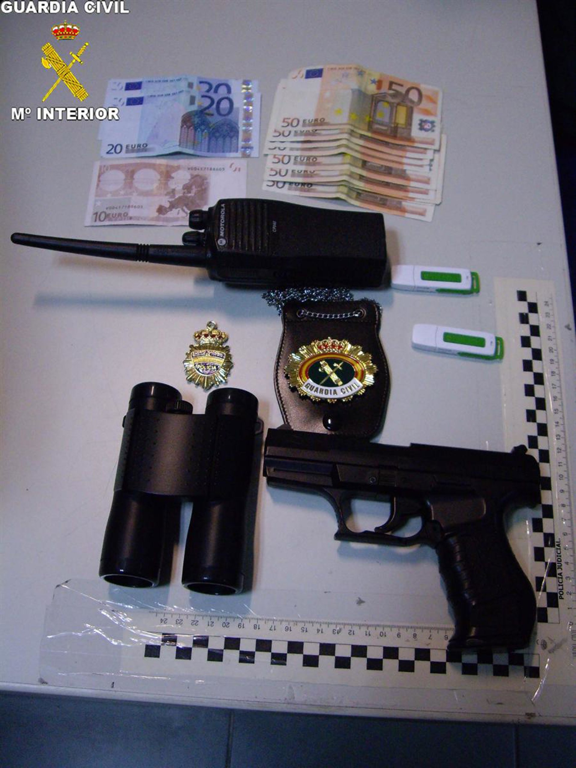 En su habitación se logró localizar una pistola simulada tipo WALTHEER P990, placa de cuello de la guardia civil, un walky talky, unos prismáticos, 500 euros en billetes, una placa de Cuerpo Nacional de Policía, y varias memorias USB que están siendo analizadas.