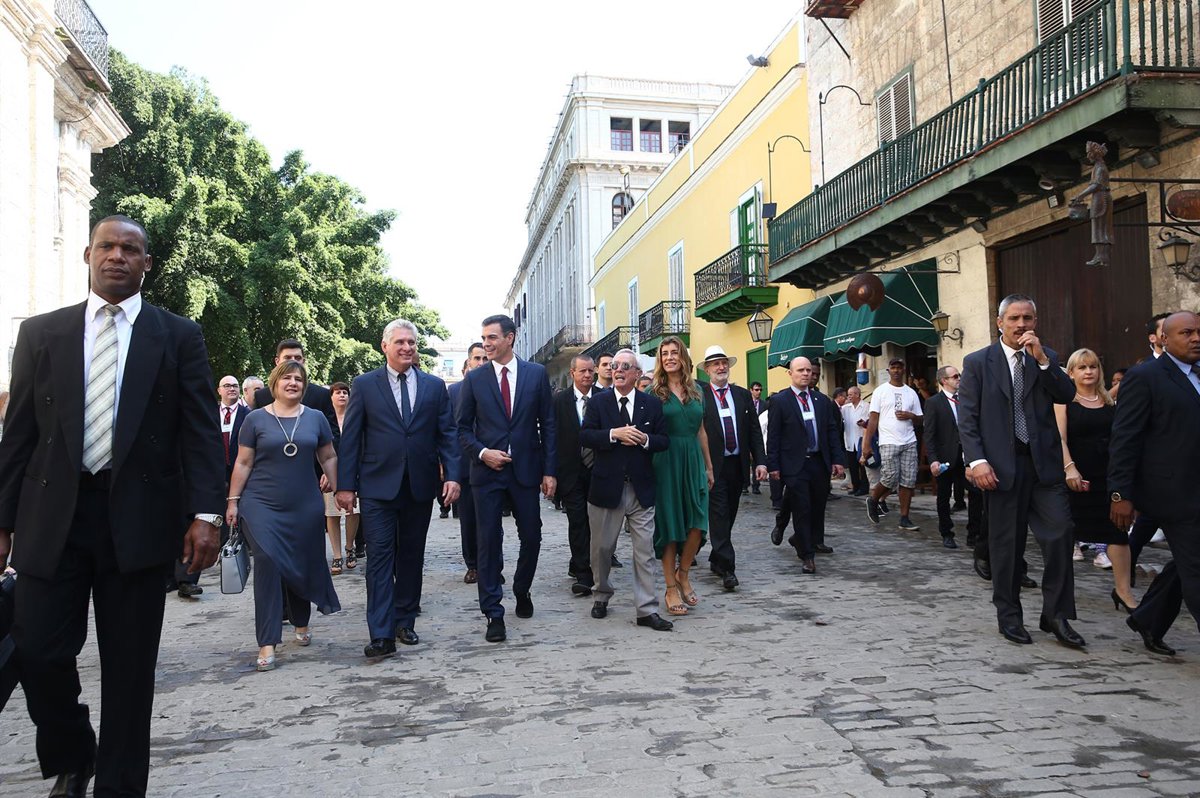 El presidente cubano, Miguel Díaz-Canel, y su esposa, Lis Cuesta, han acompañado este viernes al presidente del Gobierno español, Pedro Sánchez y a su mujer, Begoña Gómez, en un breve paseo por La Habana Vieja, guiados por el historiador de la ciudad, Eusebio Leal.