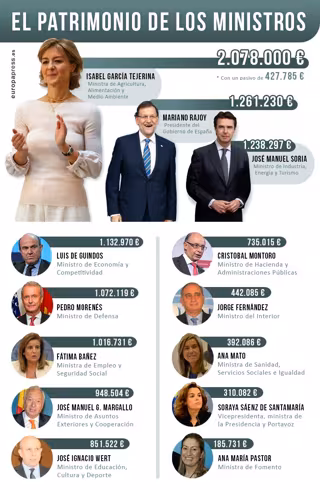 El ministro con el mayor patrimonio en el actual Gabinete es la Ministra de Agricultura, Alimentación y Medio Ambiente, Isabel García Tejerina, que, con un patrimonio de 2,77 millones de euros, ha sucedido al exministro de Agricultura, Alimentación y Medio Ambiente, Miguel Arias Cañete, como la ministra con más patrimonio del Gobierno.