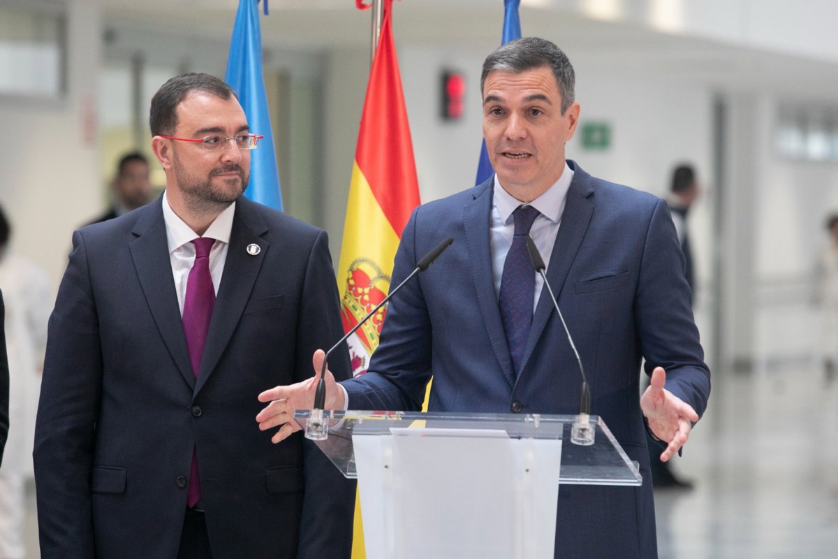 El presidente del Gobierno de España, Pedro Sánchez, junto al presidente del Principado de Asturias, Adrián Barbón, durante su intervención en el Hospital Universitario Central de Asturias (HUCA). - EUROPA PRESS/JORGE PETEIRO