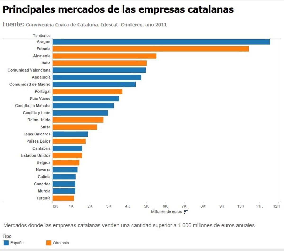 Así, el informe señala que de los 23 mercados donde venden más de 1.000 millones de euros las empresas catalanas, más de la mitad (13) son comunidades autónomas españolas y pone como ejemplo que las empresas catalanas venden a Teruel, Huesca y Zaragoza más de todo lo que exportan a Francia.