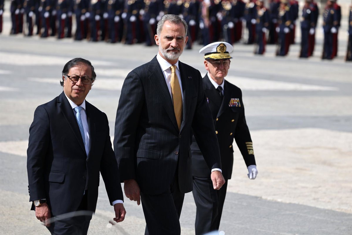 Petro y la primera dama, Verónica Alcocer, han sido recibidos a pie del Rolls Royce que les ha trasladado desde el Palacio de El Pardo, donde se hospedan, por los Reyes y a continuación los cuatro han escuchado la interpretación por parte de la Unidad de Música de la Guardia Real de los himnos nacionales de los dos países y la tradicional salva de 21 cañonazos.