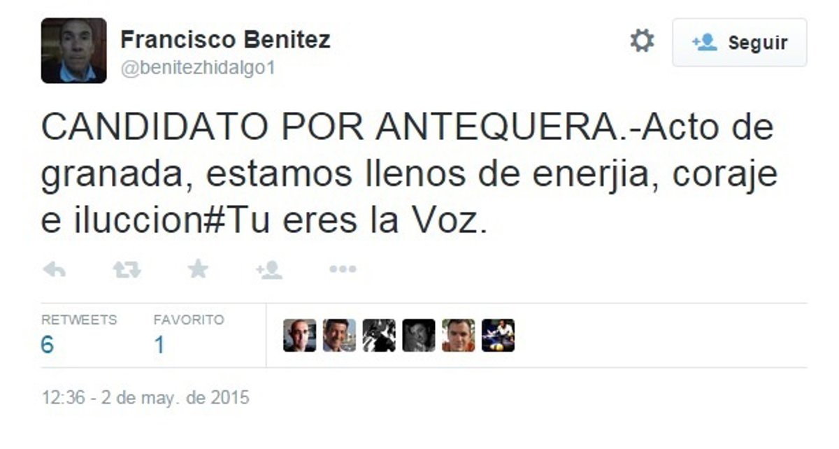 El candidato de Unión, Progreso y Democracia (UPyD) a la Alcaldía de Antequera (Málaga), Francisco Benítez, ha recibido varias solicitudes a través de Twitter y por correo electrónico para que cierre su cuenta en esta red social por faltas de ortografía.