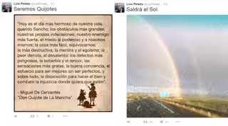 Este comentario iba acompañado de una cita del libro de Cervantes en el que se destaca "el desaliento, el temor a no tener valor" como la mayor de las derrotas o la buena conciencia como la sensación más grata. "Y sobre todo, nuestra disposición para hacer el bien, tal cual, combatiendo sin desmayo cada una de las injusticias de toda jornada, donde quiera que estén", zanja la cita reproducida por Pineda.