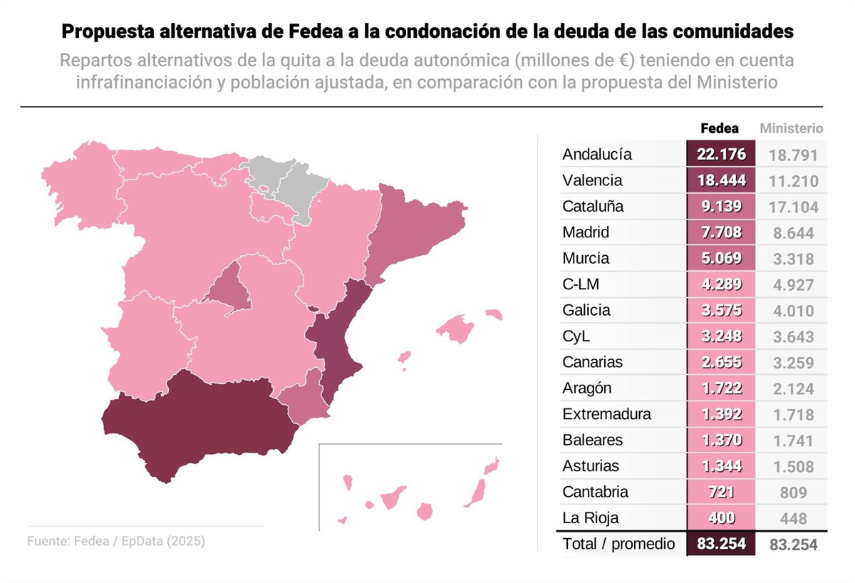 Por su parte, el reparto alternativo que propone Fedea en base a la infrafinanciación y la población ajustada beneficiaría a Andalucía, Comunidad Valenciana y Murcia, que verían incrementado su perdón de la deuda.