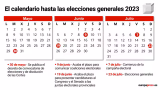 La elecciones se tienen que celebrar 54 días después de la disolución de las Cámaras. Los comicios tendrán lugar el 23 de julio, por lo que Pedro Sánchez ha propuesto publicar el Decreto de convocatoria electoral el 30 de mayo.