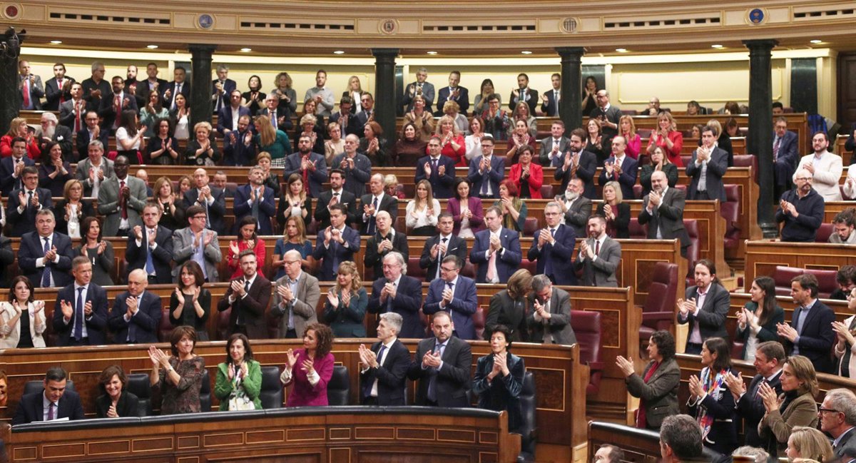 Los diputados socilistas y de Unidas Podemos aplauden al presidente del Gobierno en funciones, Pedro Sánchez, durante la primera sesión de su debate de investidura en la XIV Legislatura en Madrid (España), a 4 de enero de 2020. - Eduardo Parra - Europa Press