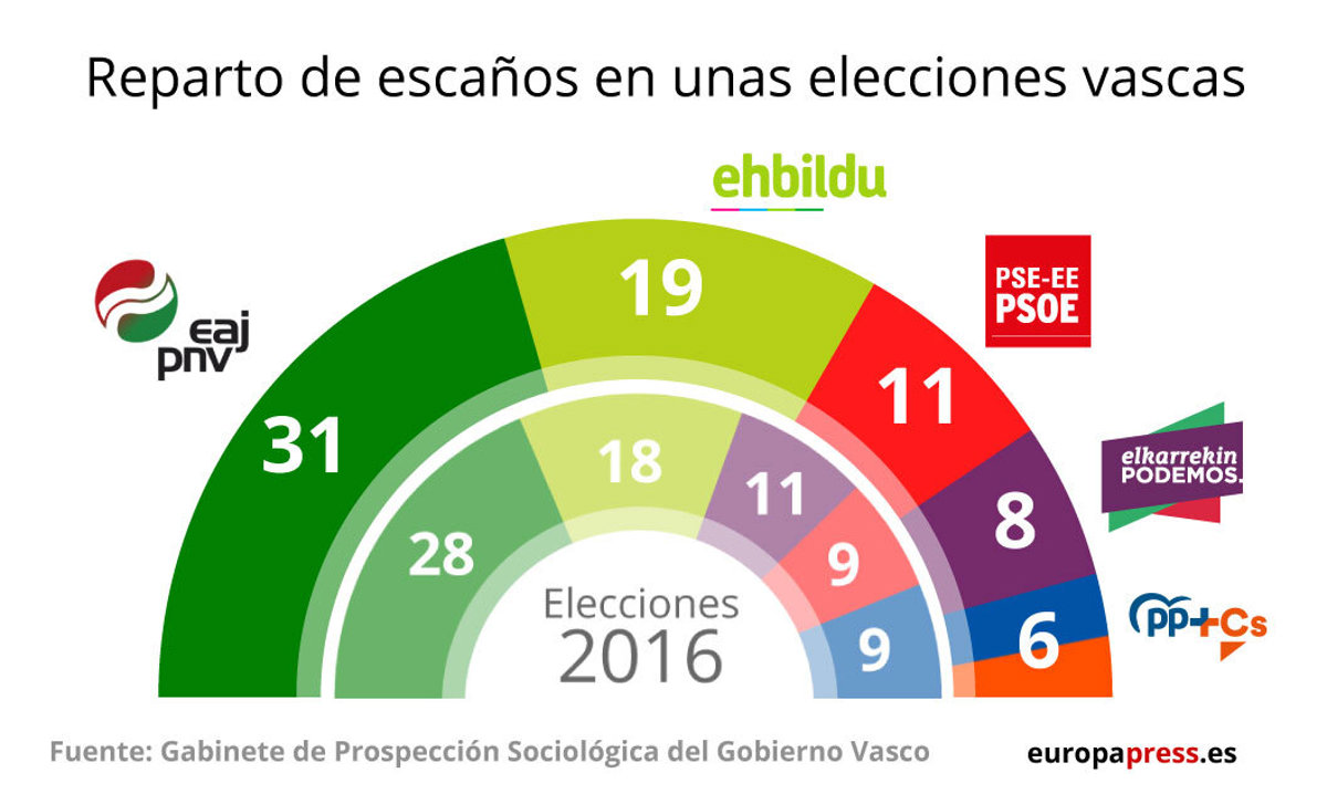 El PNV volvería a ganar las próximas elecciones al Parlamento Vasco del 12 de julio al conseguir 31 parlamentarios, tres más, seguido de EH Bildu con 19 escaños, uno más, y el PSE-EE con 11, dos más. Elkarrekin Podemos-IU y el Partido Popular, que se presenta por primera vez con Ciudadanos, pierden tres cada uno, quedándose los morados con ocho escaños y PP+Cs con seis. Vox no obtendría representación.