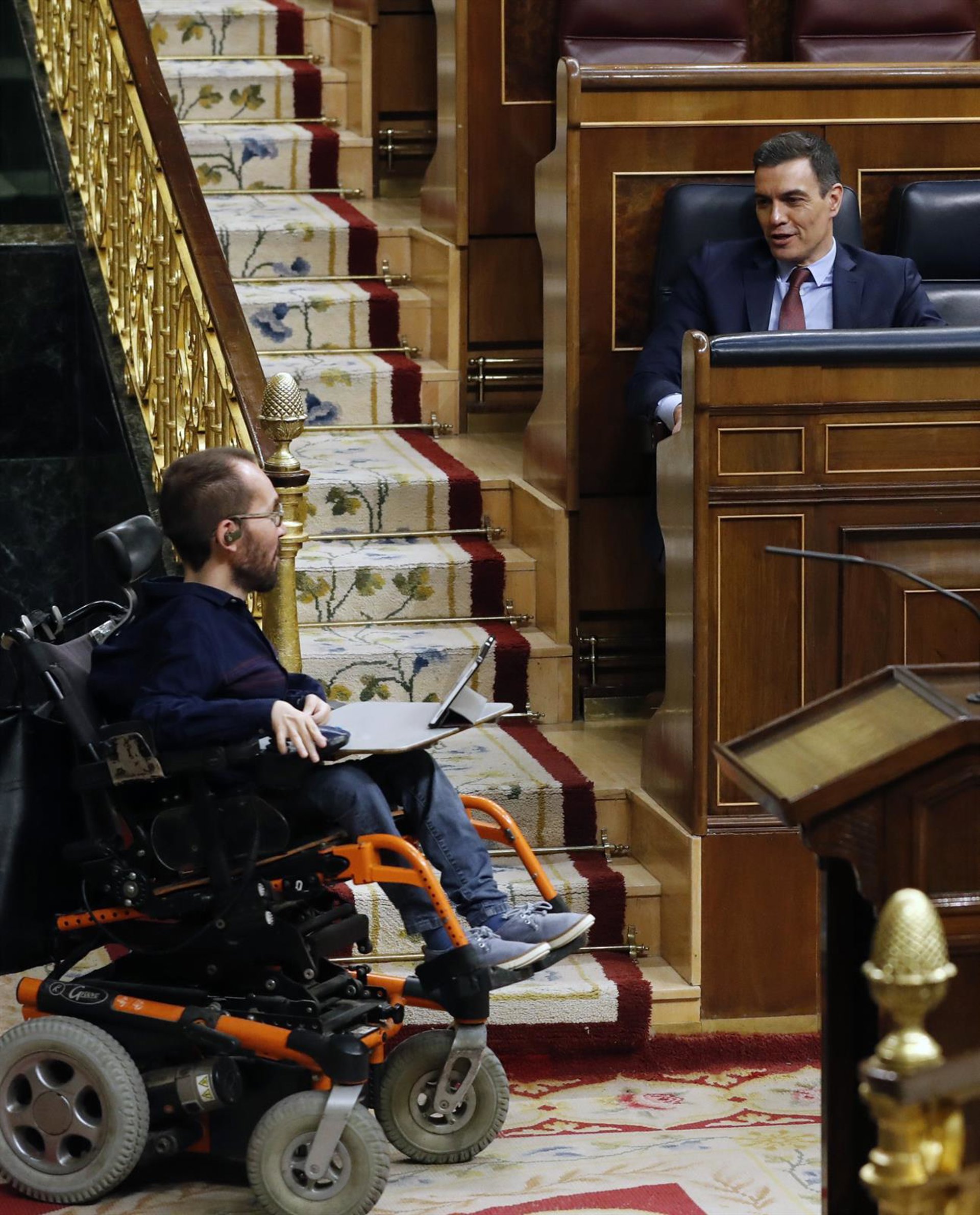 El presidente del Gobierno, Pedro Sánchez, conversa con el portavoz de Unidas Podemos, Pablo Echenique, en el Pleno del Congreso - Pool