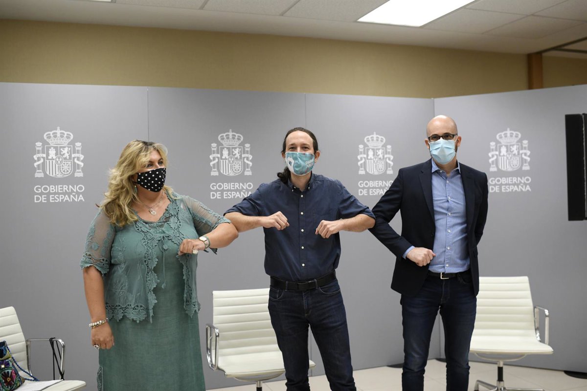Archivo - El vicepresidente segundo Pablo Iglesias (c), saluda al secretario de Estado de Derechos Sociales Nacho Álvarez (1i); y a la presidenta de la Federación de Asociaciones de Mujeres Gitanas (FAKALI), Beatriz Carrillo de los Reyes - Óscar Cañas - Europa Press - Archivo