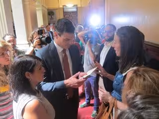 Pedro Sánchez, que se encontraba en compañía de la socialista asturiana Adriana Lastra tras la toma de posesión de Javier Fernández como presidente del Principado, recogió la carta de manos de la diputada de Podemos, quien le explicó que se trataba del escrito de una militante socialista que les pidió que se lo trasladasen al líder del PSOE.