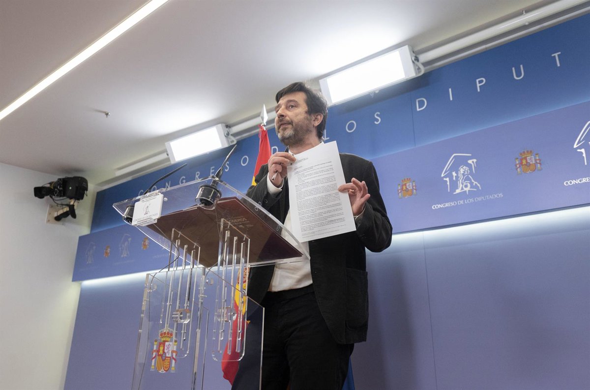 El portavoz de Podemos, Rafa Mayoral, interviene en una rueda de prensa posterior a una Junta de Portavoces en el Congreso de los Diputados, a 6 de abril de 2021, en Madrid (España). - EUROPA PRESS/A.Ortega.POOL - Europa Press