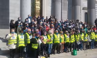 Representantes de estas formaciones han vuelto a escenificar su rechazo a esta norma en una concentración que diversas organizaciones sociales como 'No somos delito' y los 'yayoflautas' han convocado en la fachada principal del Congreso. Lo han hecho tapándose la boca con pañuelos azules y gritando consignas contra la ley.