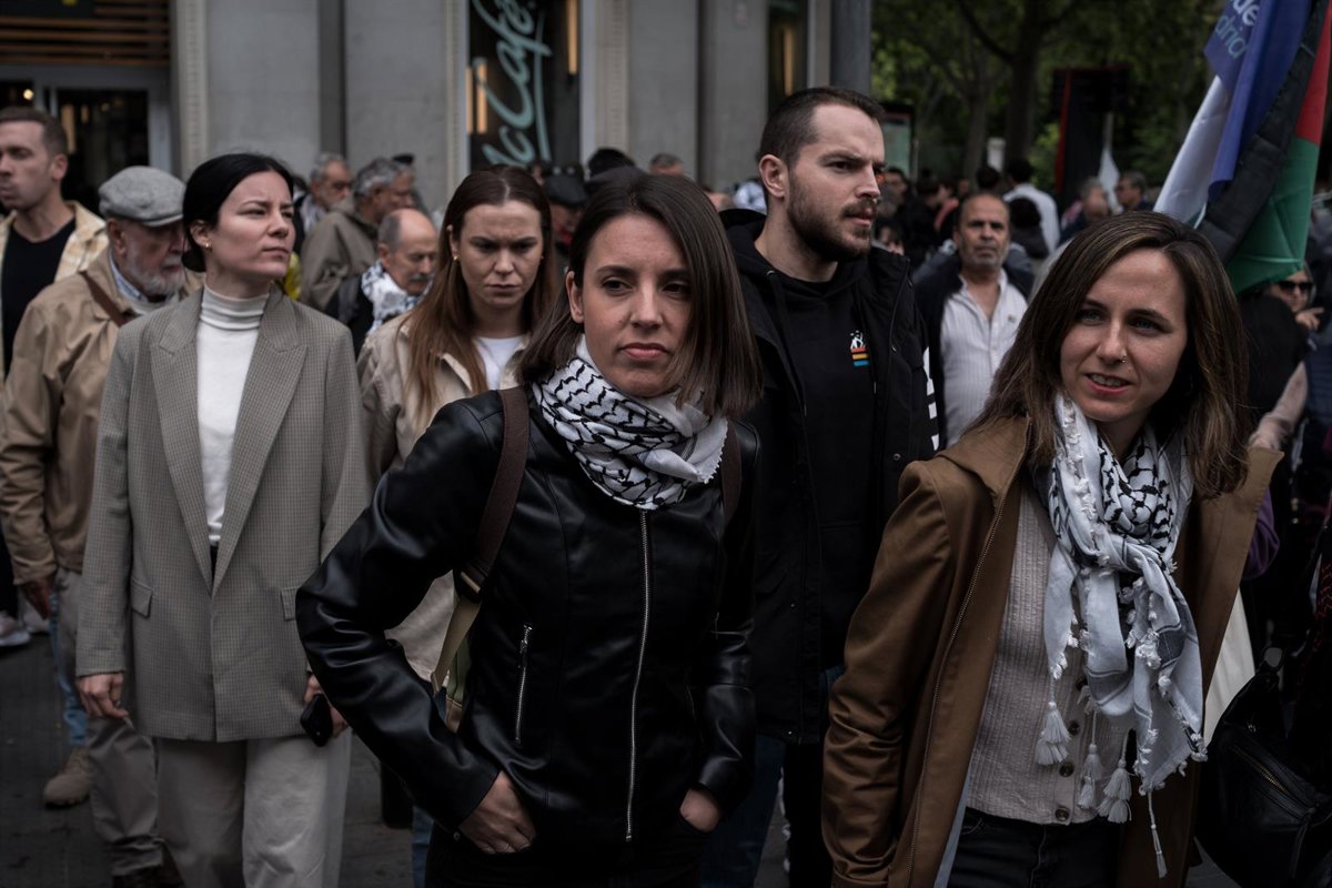 La eurodiputada de Podemos, Irene Montero (i) y la secretaria general de Podemos, Ione Belarra (d), durante la manifestación en conmemoración de la Nakba, a 15 de mayo de 2025, en Madrid (España). - Diego Radamés - Europa Press