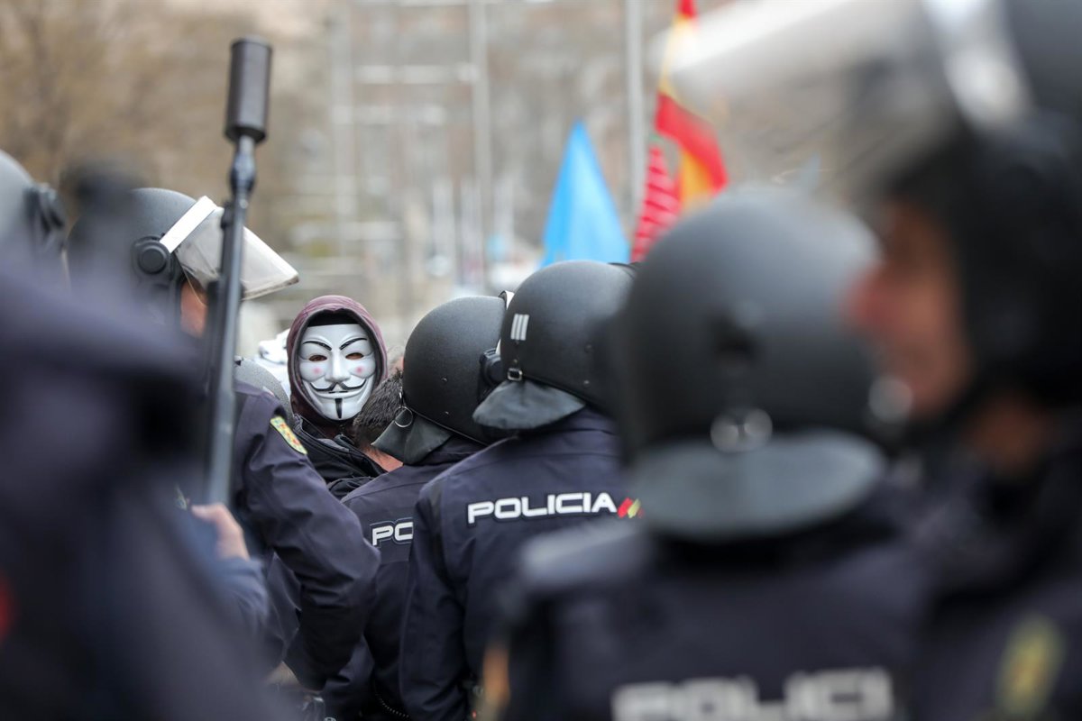 Agentes de la Policía Nacional frente a los manifestantes con máscaras de Anonymous y banderas de España en las inmediaciones del Congreso - Jesús Hellín - Europa Press