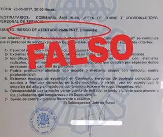 Uno de los mensajes que circulan por las redes sociales tiene la apariencia de un informe policial firmado por un Subinspector jefe de la Comisaría de San Blas, en Madrid, y llama a extremar las medidas de seguridad ante el riesgo de un posible atentado yihadista. "Podría producirse atentado tipo suicida o mediante ataque con vehículo contra población civil", puede leerse en el texto.