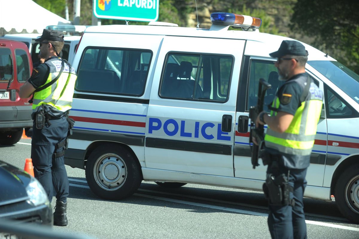 Dos agentes de la Policía Nacional, junto a una furgoneta de la Policía de Francia, en el punto de control de seguridad en el Puente de Behobia, en la frontera del País Vaco y Francia, con motivo la cumbre del G7 en Biarritz. - H.Bilbao - Europa Press