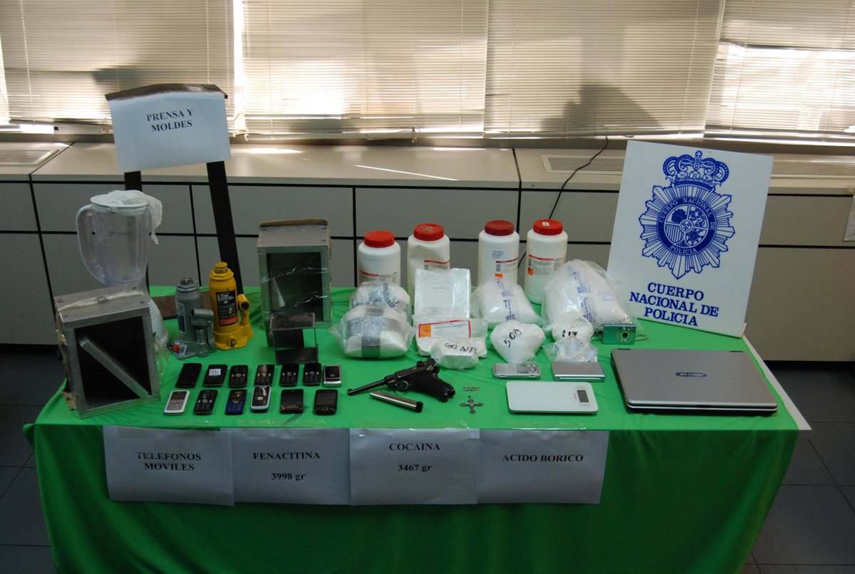 También se incautaron 12.000 gramos de fenacetina, un laboratorio para la manipulación de cocaína; así como moldes y logotipos para la elaboración de nuevos bloques; 2.250 euros; cinco vehículos; y un arma corta.