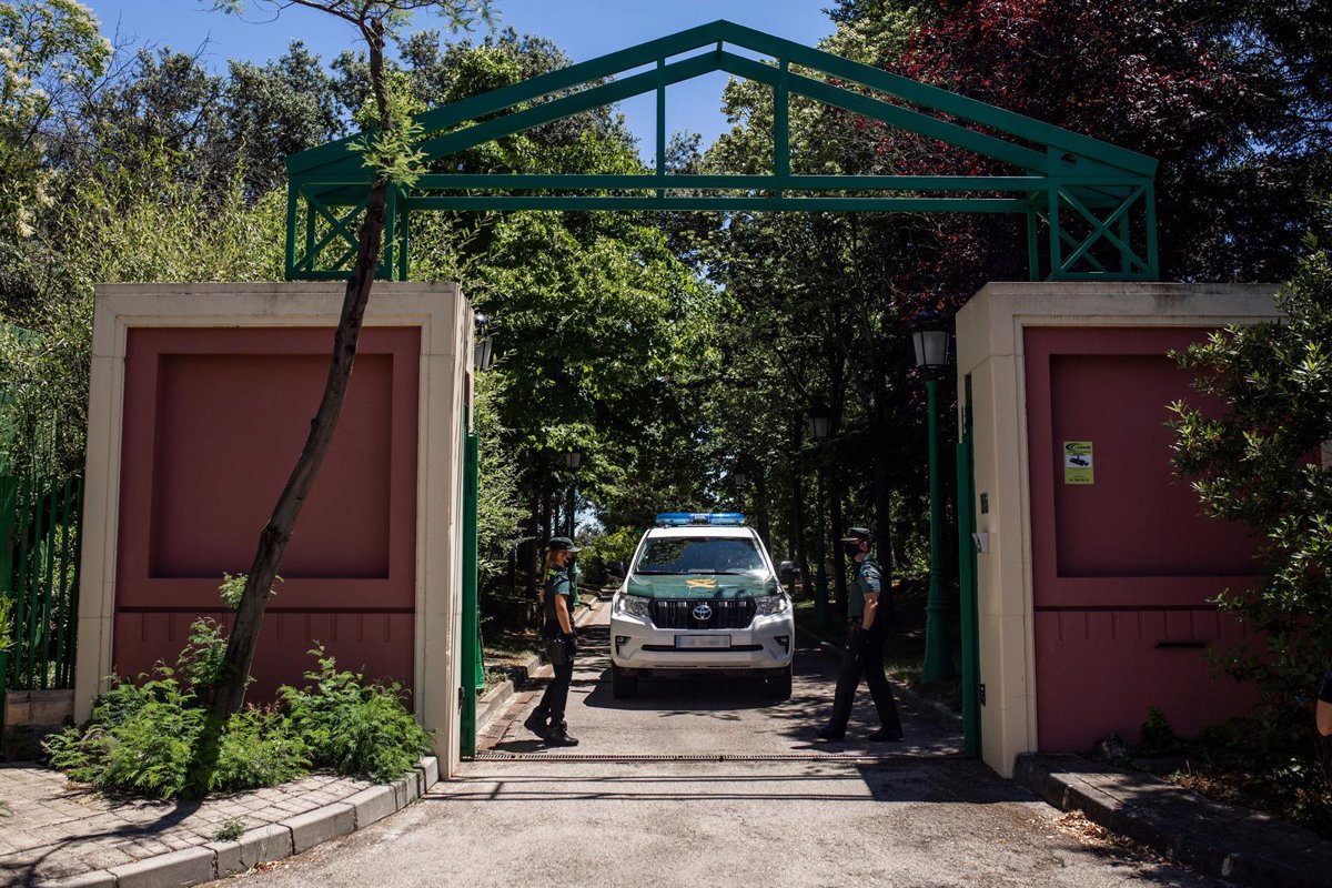Un vehículo y varios agentes de la Guardia Civil vigilan en las inmediaciones del domicilio del productor de televisión José Luis Moreno el día de su detención, a 29 de junio de 2021, en Boadilla del Monte, Madrid (España). - Alejandro Martínez Vélez - Europa Press