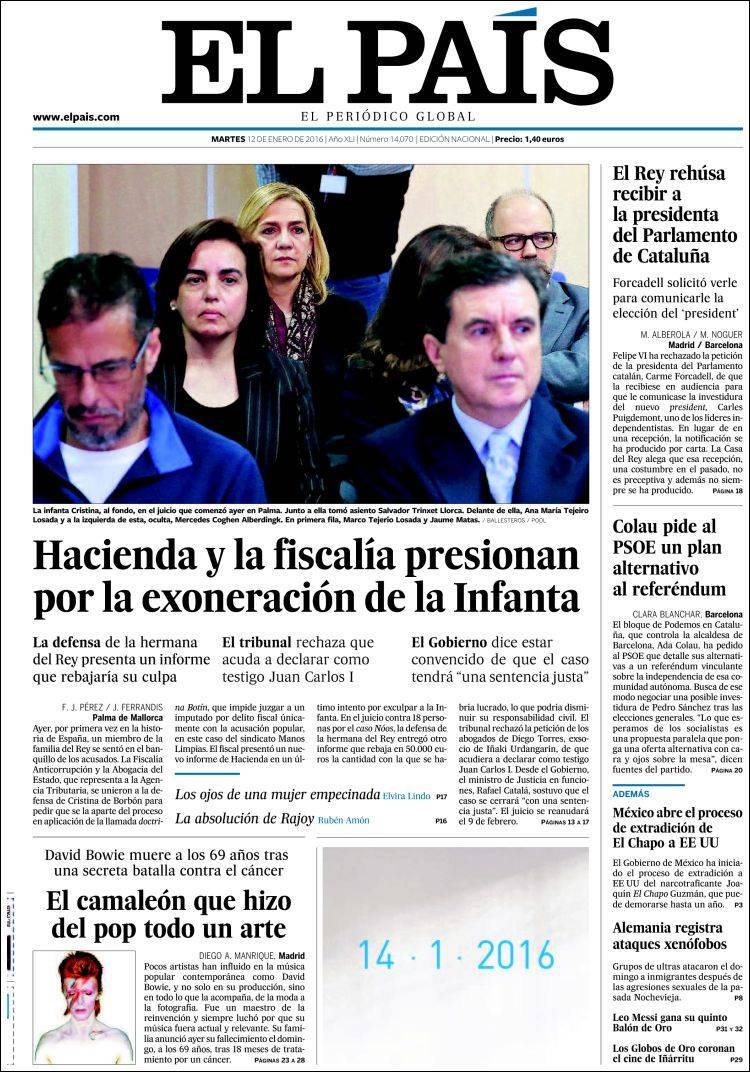 EL PAÍS: "Hacienda y la fiscalía presionan por la exoneración de la Infanta"; "El Rey rehúsa recibir a la presidenta del Parlamento de Cataluña"; "Colau pide al PSOE un plan alternativo al referéndum"; "El camaleón que hizo del pop todo un arte. David Bowie muere a los 69 años".
