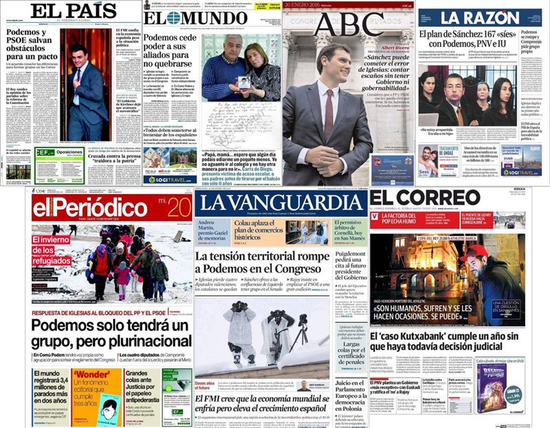 EL PAÍS: "Podemos y PSOE salvan obstáculos para un pacto "; "El Rey sondea la opinión de los partidos sobre la reforma de la Constitución"; "La deriva de Polonia (1): Cruzada contra la prensa 'traidora a la patria"; "El FMI confía en la economía española pese a la situación política"; "Mauricio Macri: 'El Gobierno de Kirchner dejó que avanzara el narcotráfico".