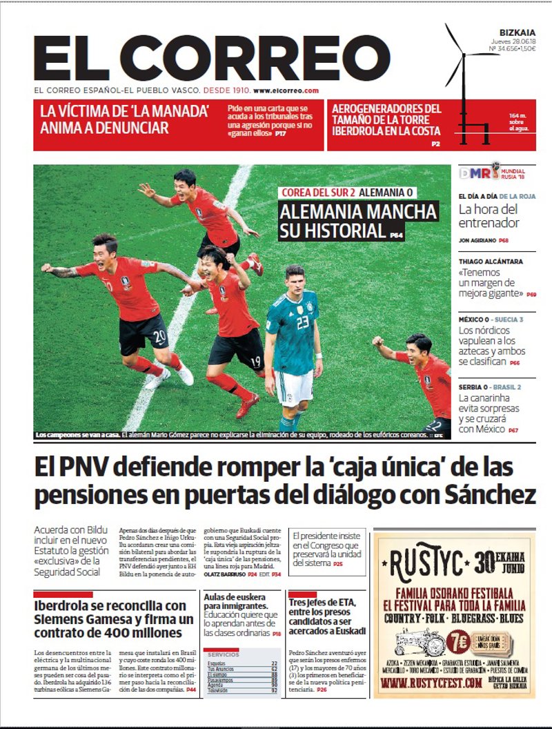 EL CORREO: "Corea del Sur 2 Alemania 0. Alemania mancha su historial"; "El PNV defiende romper la 'caja única' de las pensiones en puertas del diálogo con Sánchez"; "Iberdrola se reconcilia con Siemens Gamesa y firma un contrato de 400 millones"; "Tres jefes de ETA, entre los presos candidatos a ser acercados a Euskadi".