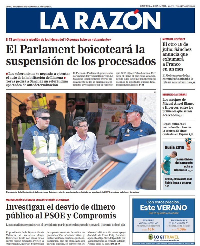 LA RAZÓN: "El Parlament boicoteará la suspensión de los procesados"; "El otro 18 de julio: Sánchez anuncia que exhumará a Franco en un mes"; "Investigan el desvío de dinero público al PSOE y Compromís"; "El otro 18 de julio: Sánchez anuncia que exhumará a Franco en un mes".