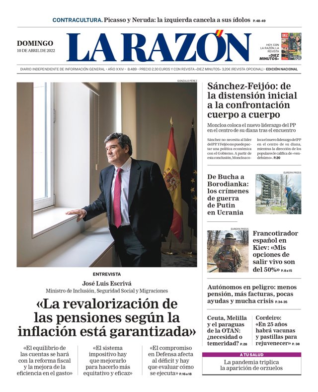 LA RAZÓN: "Escrivá: La revalorización de las pensiones según la inflación está garantizada"; "Sánchez-Feijóo: de la distensión inicial a la confrontación cuerpo a cuerpo"; "De Bucha a Borodianka: los crímenes de guerra de Putin en Ucrania".