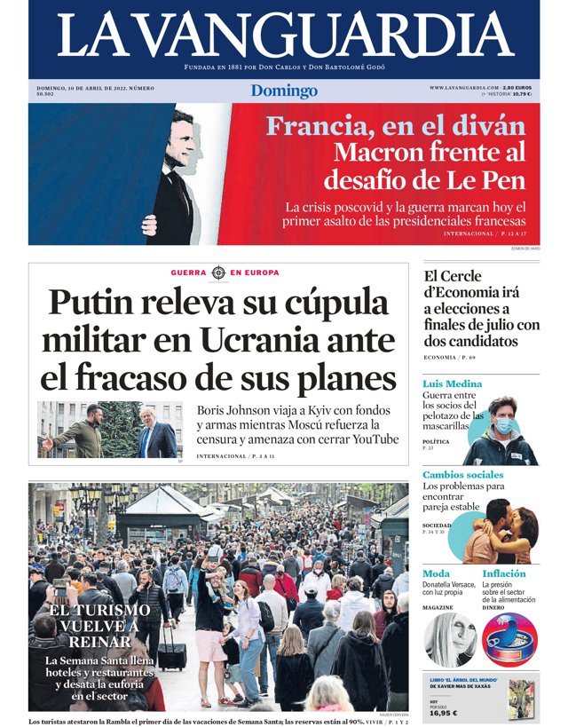 LA VANGUARDIA: "Putin releva su cúpula militar en Ucrania ante el fracaso de sus planes"; "El turismo vuelve a reinar"; "Francia, en el diván Macron frente al desafío de le Pen"; "ElCercle d'Economia irá a elecciones a finales de julio con dos candidatos".