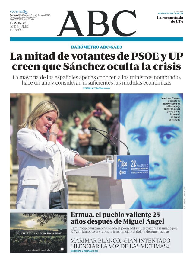 ABC: "La mitad de votantes de PSOE y UP creen que Sánchez oculta la crisis"; Ermua, el pueblo valiente 25 años después de Miguel Ángel".