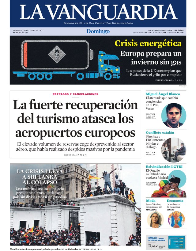 LA VANGUARDIA: "Crisis energética: Europa prepara un invierno sin gas"; "La fuerte recuperación del turismo atasca los aeropuertos europeos"; "Miguel Ángel Blanco, el atentado que cambió conciencias en el País Vasco"; "Sánchez y ERC intentan blindar el diálogo"; "El orgullo multidudinario vuelve a Madrid".