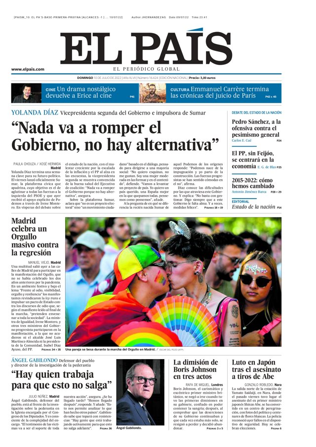 EL PAÍS: "Entrevista a Yolanda Díaz: Nada va a romper el Gobierno, no hay alternativa"; "Ángel Gabilondo: Hay quien trabaja para que esto no salga"; "La dimisión de Boris Johnson en tres actos"; "Luto en Japón tras el asesinato a tiros de Abe"; "Pedro Sánchez a la ofensiva contra el pesimismo general"; "El PP, sin Feijóo, se centrará en la economía"; "Madrid celebra un Orgullo masivo contra la regresión".
