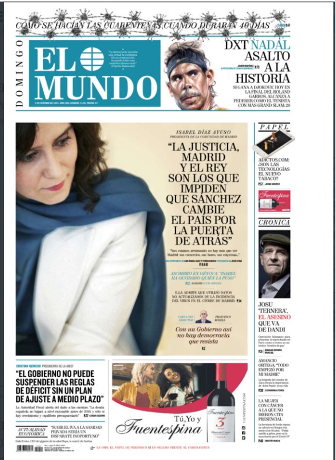 EL MUNDO: "Isabel Díaz Ayuso: 'La justicia, Madrid y el Rey son los que impiden que Sánchez cambie el país por la puerta de atrás"; "Nadal, asalto a la historia".
