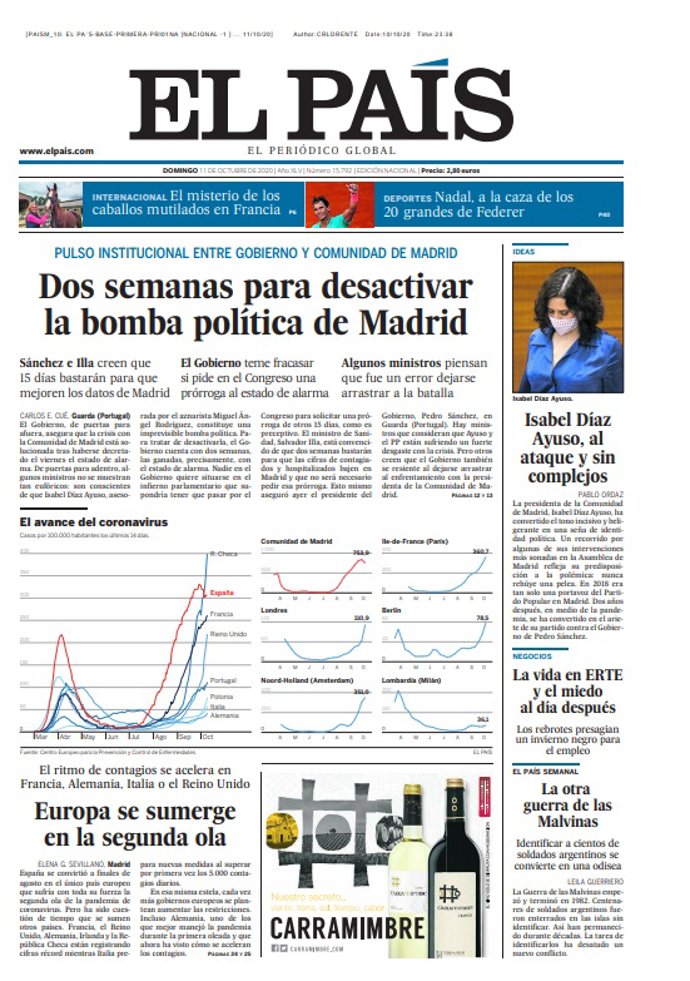 EL PAÍS: "Dos semanas para desactivar Madrid. Pulso institucional entre Gobierno y Comunidad de Madrid"; "Isabel Díaz Ayuso, al ataque sin complejos"; "Europa se sumerge en la segunda ola".