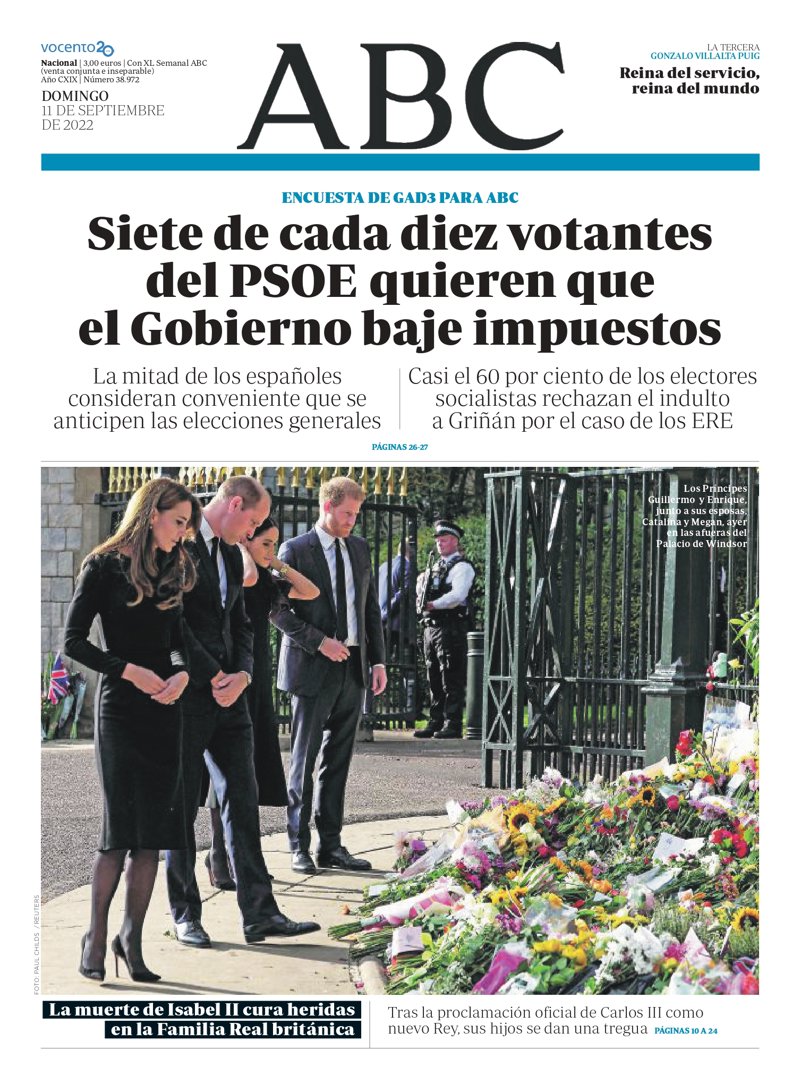 ABC: "Siete de cada diez votantes del PSOE quieren que el Gobierno baje impuestos"; "La muerte de Isabel II cura heridas en la Familia Real británica".