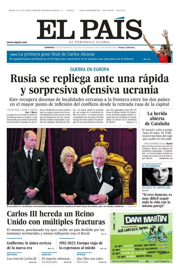 EL PAÍS: "Carlos III hereda un Reino Unido con múltiples fracturas"; "Rusia se repliega ante una rápida y sorpresiva ofensiva Ucrania"; "La herida abierta de Cataluña".