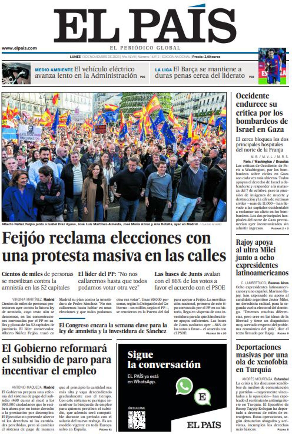 EL PAÍS: "Feijóo reclama elecciones con una protesta masiva en las calles"; "El Gobierno reformará el subsidio de paro para incentivar el empleo"; "Occidente endurece su crítica por los bombardeos de Israel en Gaza"; "Rajoy apoya al ultra Milei junto a ocho expresidentes latinoamericanos"; "Deportaciones masivas por una ola de xenofobia en Turquía".